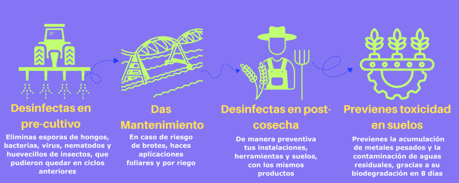 Cabe mencionar, que en base a nuestra experiencia contamos con protocolos de aplicación en combinación y especifícos por cultivo y enfermedad, con la ventaja de la nula toxicidad residual, en suelos y frutos.