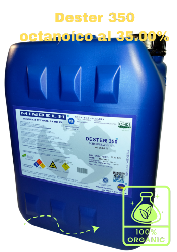 Dester 350 ácido peracético octanoíco al 35%, con espectro Biocida de 1 a 14, con una fuerza desifectante 10 veces mayor a los peracéticos normales, actúa en 15 segundos y protege hasta por 15 días por dosis. Oxígena mientras desinfecta.