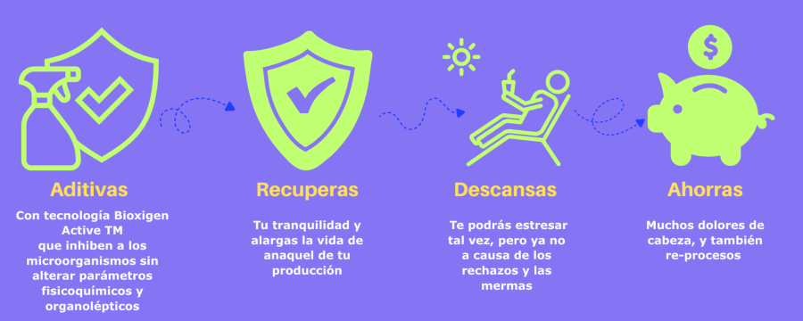 No espera a que los microorganismos se multipliquen para atacarlos. Los inhibe desde el inicio. Traducción: cero sorpresas al día 15 de vida de anaquel.